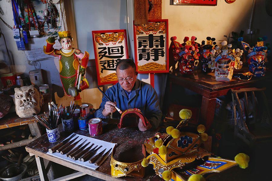 戴修义正在给傩面具上彩。郎溪县委宣传部供图