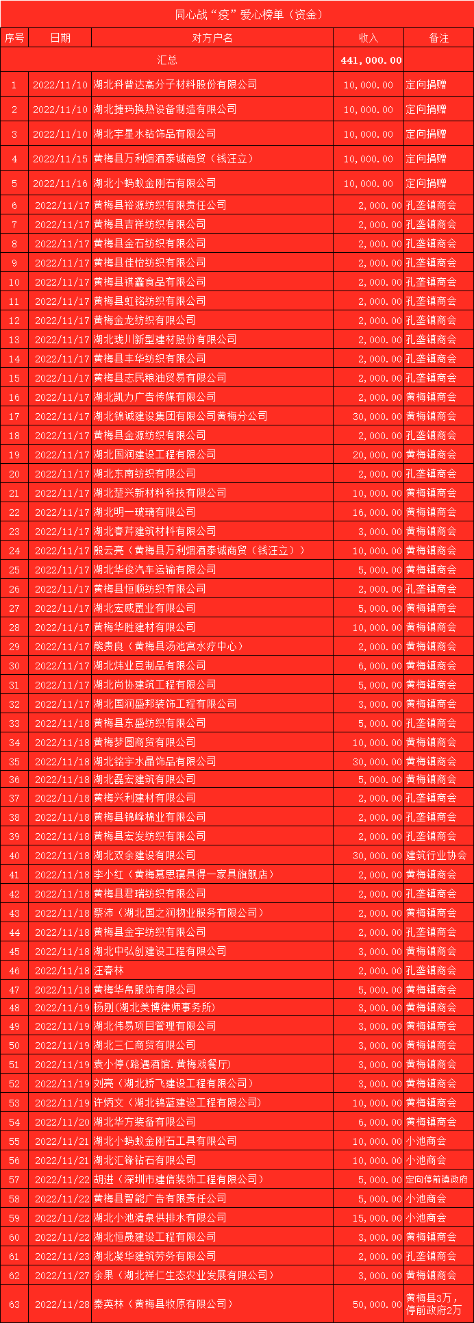 黄梅镇、孔垄镇、小池镇等商会闻“疫”而动,发动会员和企业捐献爱心。截至11月28日,县慈善会共收到商会会员和企业爱心捐款44.1万元。杉木乡、五祖镇、停前镇、柳林乡等乡镇商会组织会员就地抗疫,积极参与、全力配合党委政府抗疫工作。