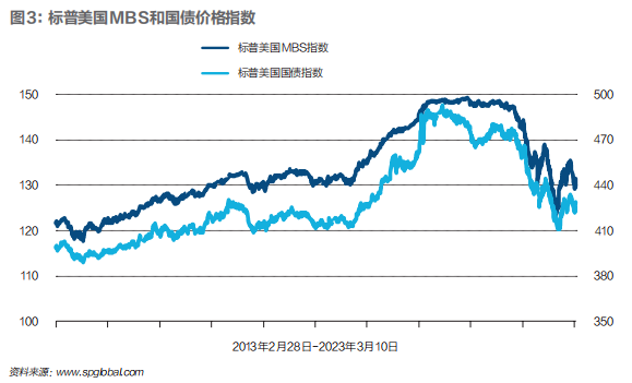 图3是标普美国MBS和国债价格指数。自2022年3月开始加息,MBS价格指数一路走低,至同年10月底的低点大概下降了20%,此后开始反弹。进入2023年3月以来,价格指数还是上升的,目前的指数水平接近于2018年底。国债价格指数走势类似。在2008年金融危机期间,雷曼兄弟持有的衍生品价格大幅下跌。再加上发行的金融产品大量卖给全球各地的其他金融机构,因此,雷曼兄弟破产后引发了连锁反应,对全球金融系统的影响的广度和深度都是硅谷银行破产无法比拟的。