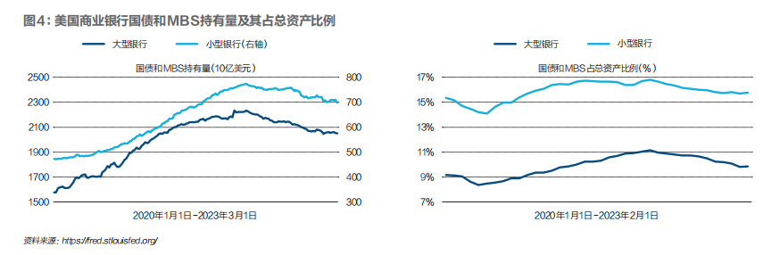 从资产端来看,自2020年以来,截至2023年3月1日,小型银行(资产规模25名以后的商业银行)持有的美国国债和MBS增长了44%,而大型银行则增长了30%。虽然小型银行的增速更快,但从美债和MBS占总资产的比例来看,小型银行的9%-11%要低于大型银行的15%-17%(图4)。