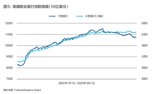 从负债端来看,存款减少主要发生在大型商业银行。自2022年3月15日至2023年3月1日,大型银行存款减少了5%,而小型银行存款则保持在相同规模(图5)。