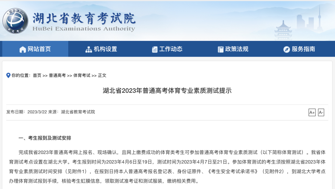3月22日湖北省教育考试院发布2023年普通高考体育专业素质测试提示明确考试安排