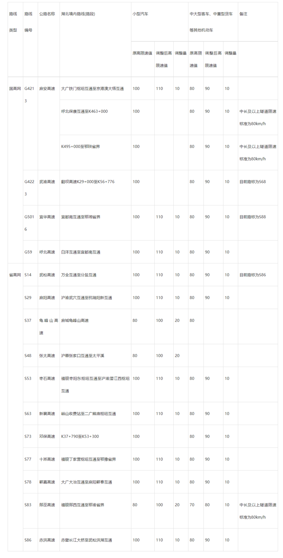 湖北省部分高速公路限速值调整表