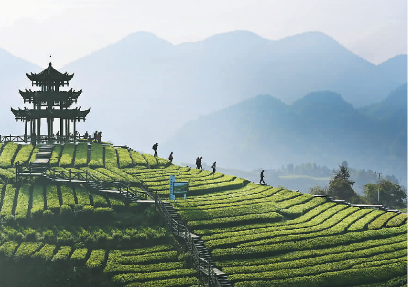 湖北省恩施土家族苗族自治州拥有180万亩茶园,综合产值超过200亿元。近年来,该州推进茶园景观化改造,变产茶区为风景区,增强茶山旅游的魅力,促进康养与茶产业互促发展。图为4月19日,游客在恩施州宣恩县伍家台贡茶山游玩。沈祥辉摄。
