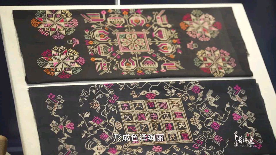 以元青布作底,用针将五彩丝线挑制在底布经线和纬线交叉的网格上,形成色泽绚丽、立体感强的图案。