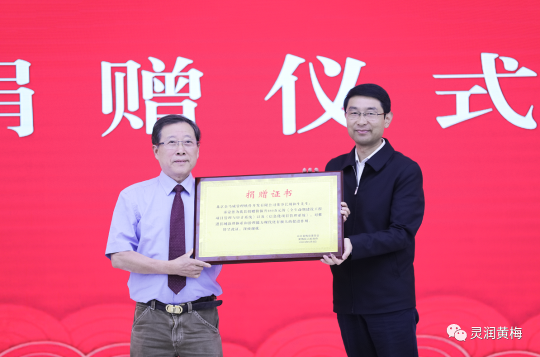 县委书记刘欲晓代表县委、县政府接受捐赠,并向北京金马威管理软件开发有限公司董事长周和生颁发了捐赠证书和黄梅县招商顾问聘书。