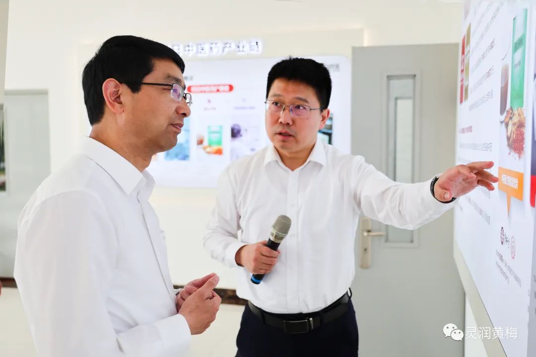 在红日药业,刘欲晓参观了企业生产车间,详细了解了红日药业从道地药材到成品制剂的全流程生产过程,并就支持黄梅医药化工产业发展,推动亿诺瑞上市与集团执行总裁蓝武军交换了意见。