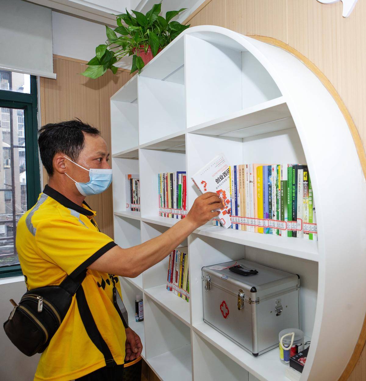 快递小哥在襄阳市襄城区古城北街商圈“红色驿站”的“小哥加油站”挑选图书。(视界网 杨东 摄)