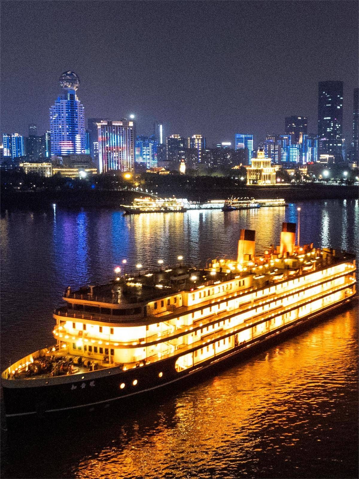 2023年8月8日傍晚,武汉两江四岸云蒸霞蔚,灯火璀璨,停靠在汉口江畔的“知音号”吸引大量游客前来游玩。(湖北日报全媒记者 何宇欣 通讯员 江朝 摄)