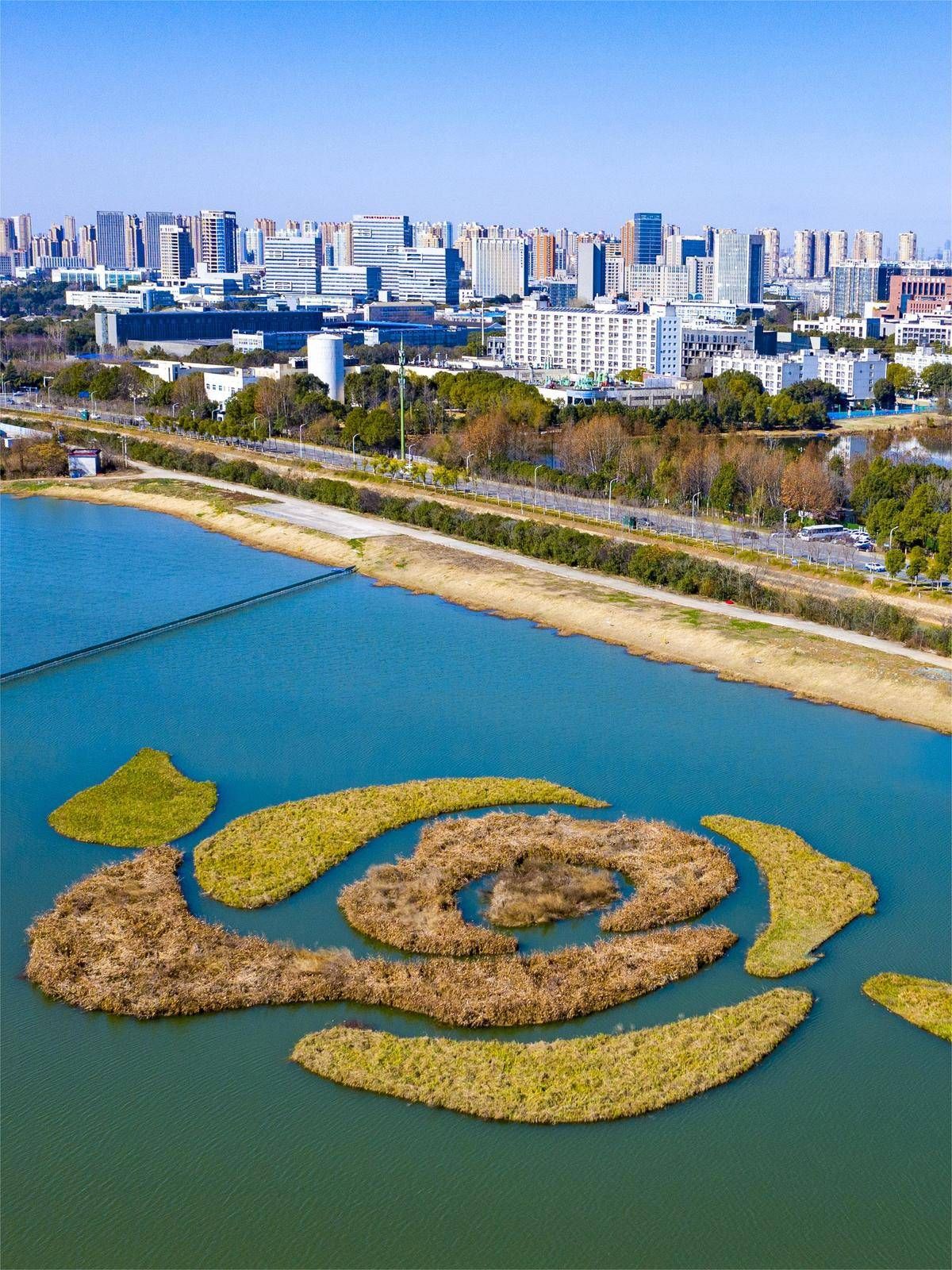 2024年1月23日,俯瞰武汉东湖高新区汤逊湖综合治理工程(一期)红旗湖区域,一片碧水蓝天。(湖北日报全媒记者 魏铼 摄)