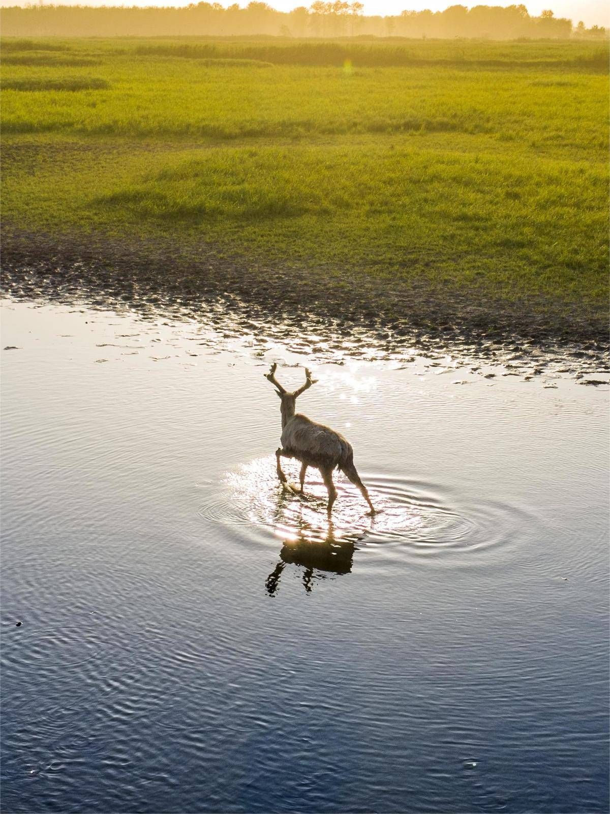 石首麋鹿自然保护区,麋鹿在滩涂中漫步。(湖北日报全媒记者 柯皓 摄)
