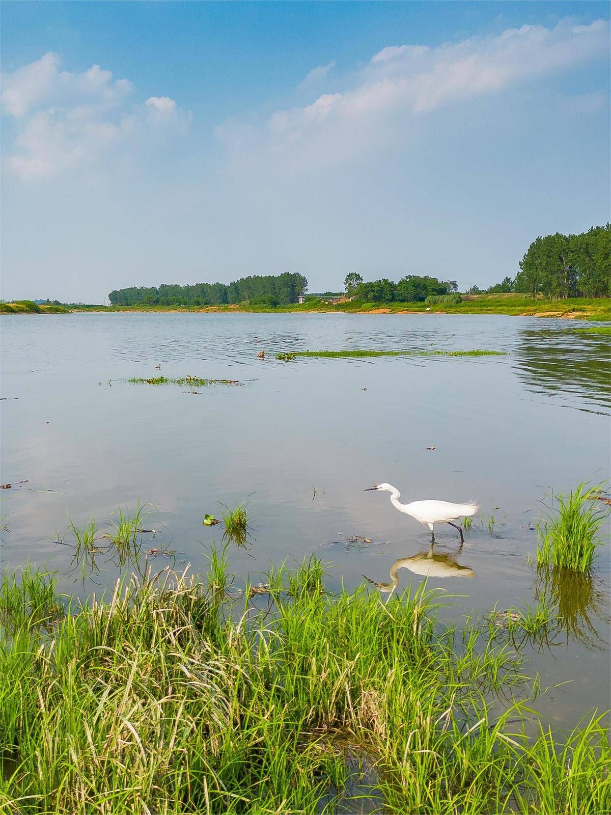 通顺河武汉经开区段,一只鹭鸟在河滩觅食。全长191公里的通顺河,流经潜江、仙桃、武汉三地,最终汇入长江。(湖北日报全媒记者 柯皓 摄)