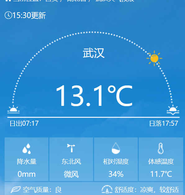 武汉周二阴天转小雨,5-11℃,周三阴天有小到中雨,夜间偏北阵风6-7级,7-12℃。