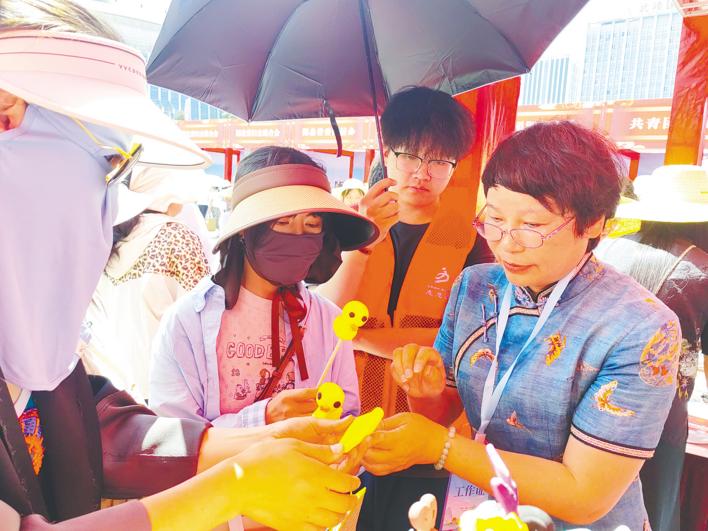 ▲武汉面塑非遗项目传承人张露文(右)向当地群众传授面塑技艺