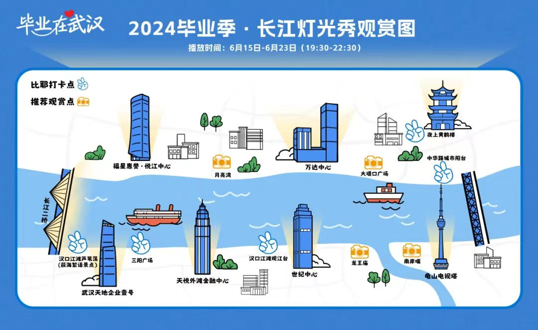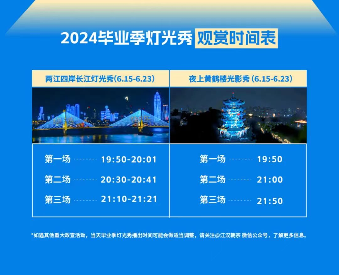 “毕业在武汉”2024毕业季·长江灯光秀观赏时刻表。图片来源:江汉朝宗微信公众号
