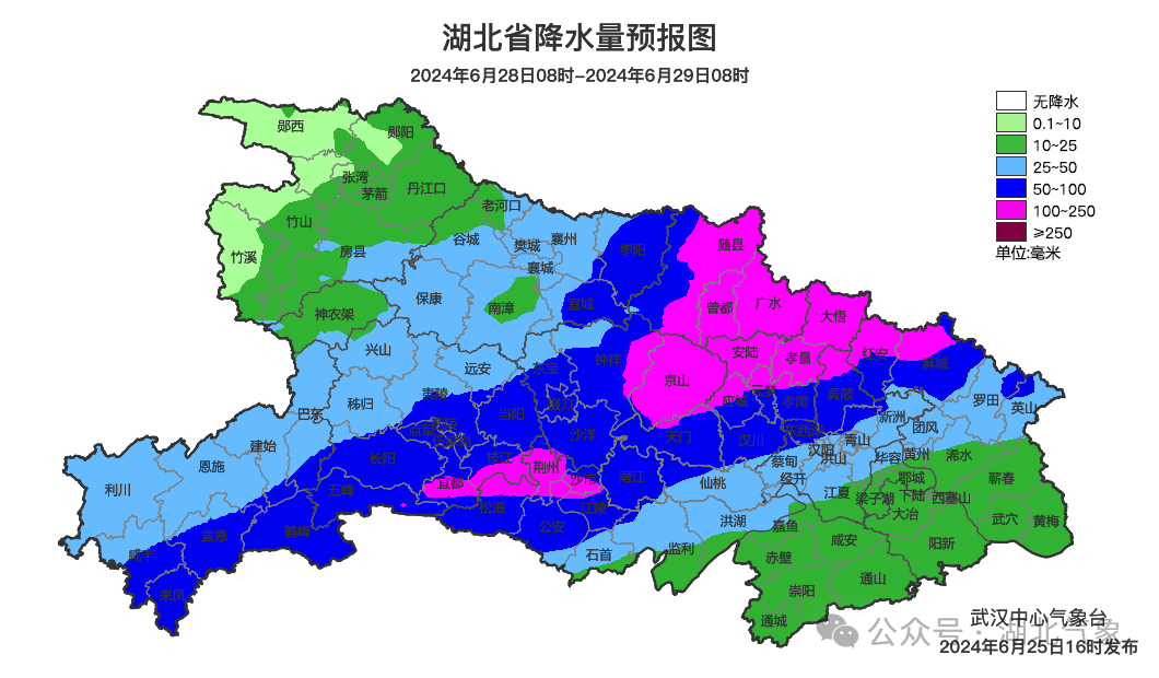 28日08时-29日08时,鄂西南、江汉平原、鄂东北阴天有大到暴雨,局地大暴雨;鄂西北西部小到中雨转多云;其他地区阴天有中到大雨,局地暴雨。省内部分地区有短时强降水、雷暴大风等强对流天气。最高气温鄂东南28~31℃、其他地区23~27℃,最低气温20~24℃,偏南风3到5级、阵风6到8级。