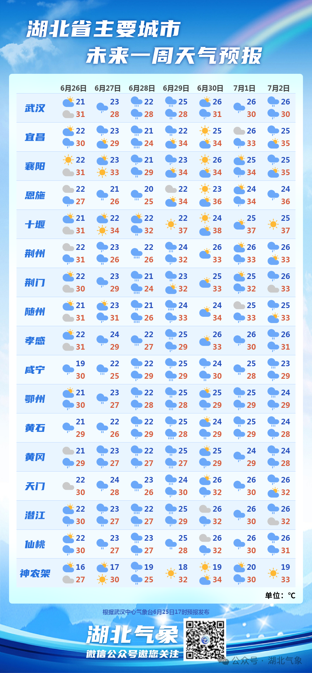 26日08时-27日08时,鄂东南阵雨转大到暴雨;鄂西南、江汉平原南部多云转中到大雨,局地暴雨;其他地区多云,局地有阵雨或雷阵雨。最高气温鄂西北31~34℃、其他地区27~31℃,最低气温20~24℃,偏南风2到3级。