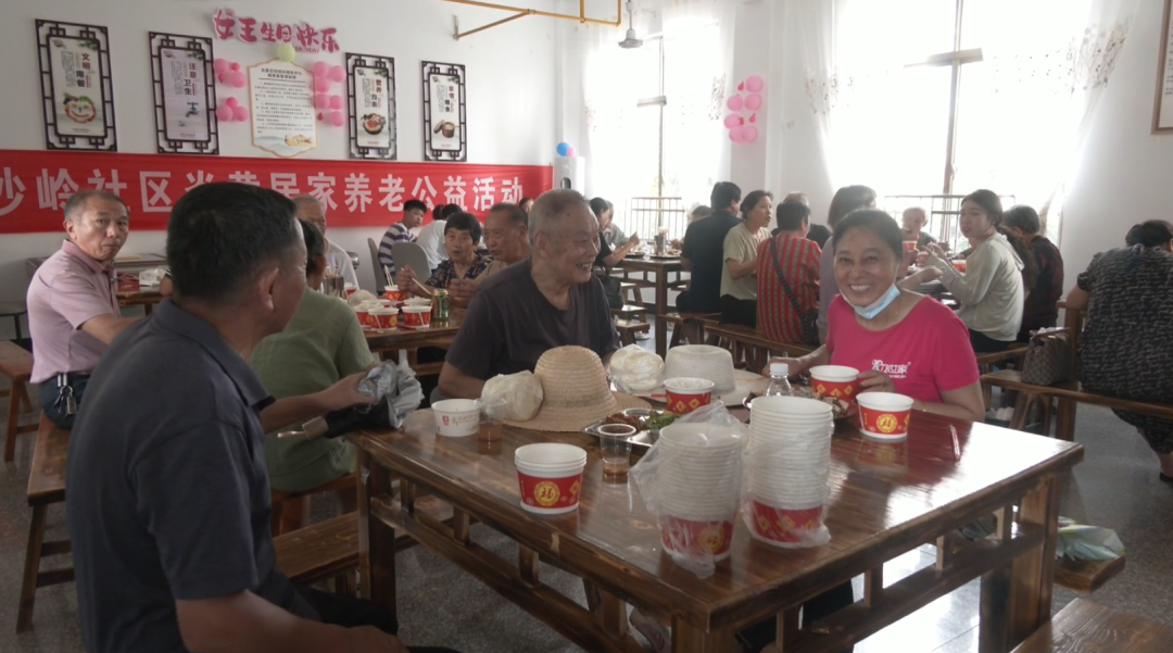 中午12点,在黄梅镇沙岭社区日间照料中心餐厅,老人们围坐在一起,一边谈论着家常,一边吃着热乎饭菜,脸上洋溢着幸福的笑容。