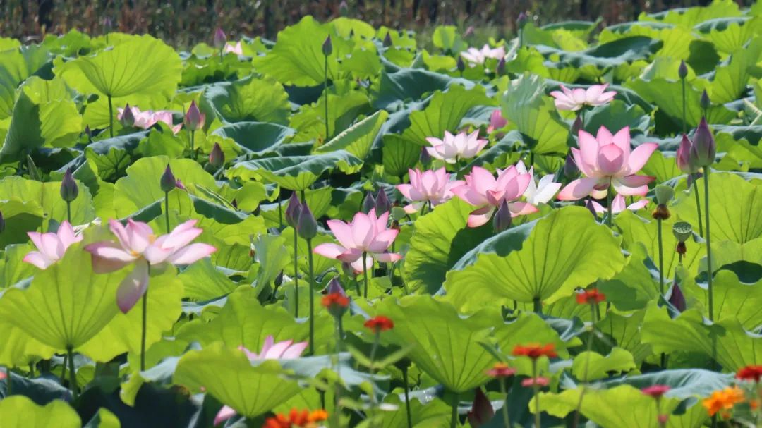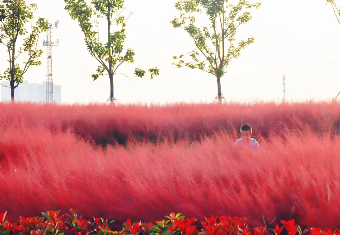 写秋天沿河大道的粉黛草一抹嫣粉灿若霞