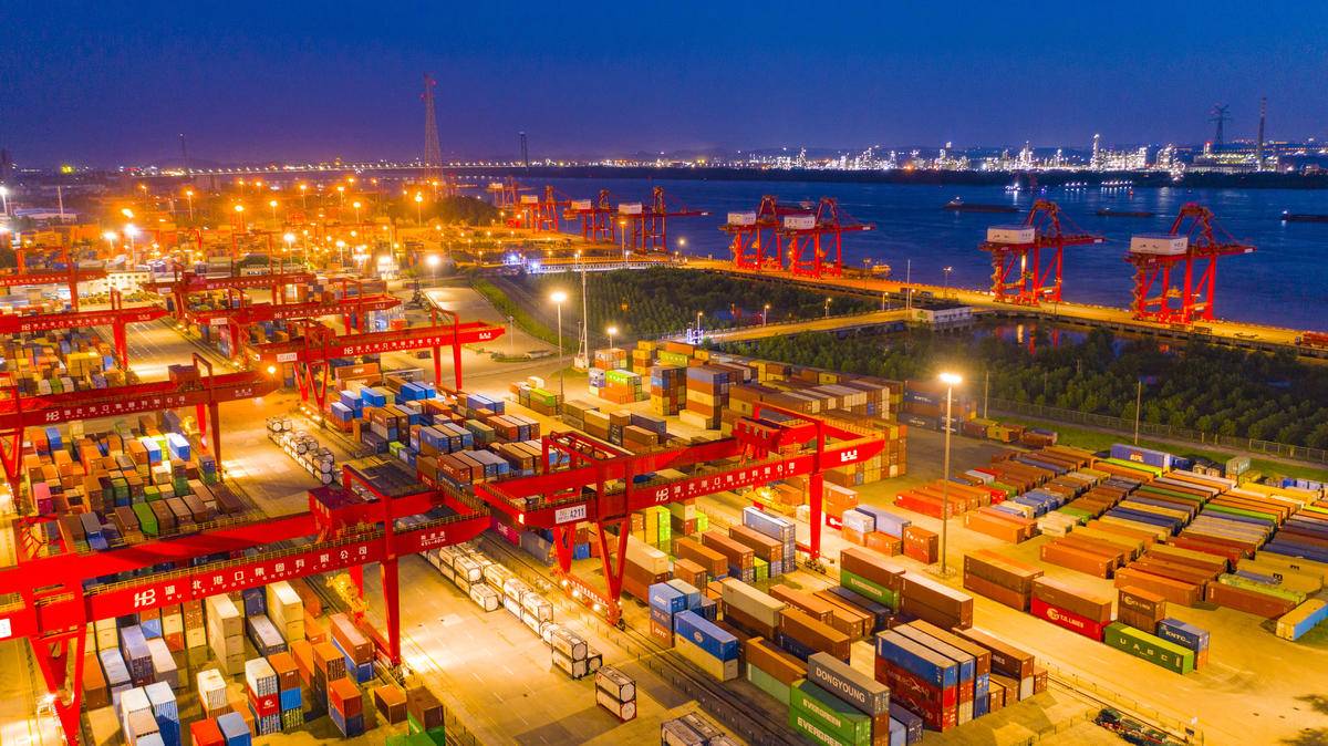 夜色中灯火通明的阳逻港,已经成为国内大循环重要节点和国内国际双循环重要枢纽。 (湖北日报全媒记者 魏铼 摄)