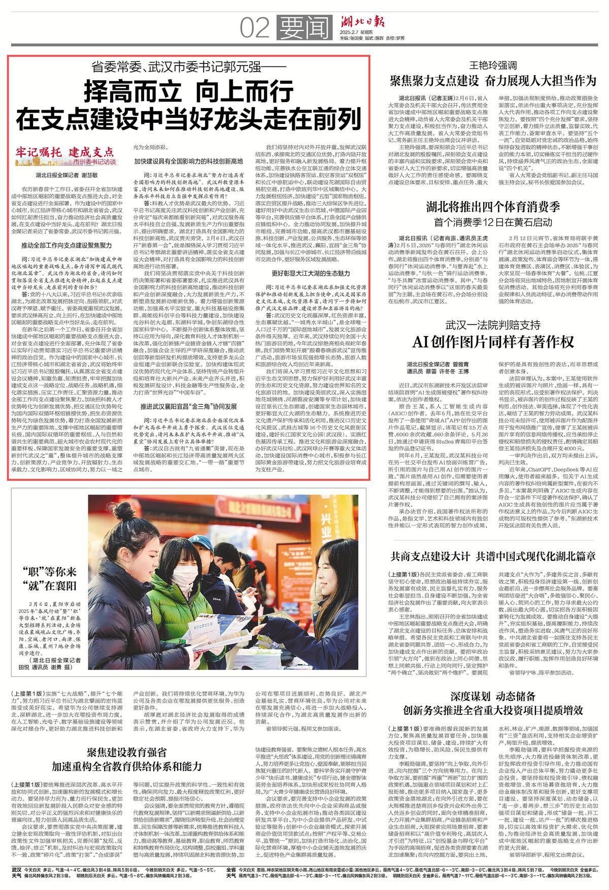 答:科教人才优势是武汉最大的优势。习近平总书记高度关注武汉科技创新和产业创新,充分肯定“每次来都能看到新突破”,对武汉服务高水平科技自立自强、发展新质生产力作出重要指示、提出明确要求。湖北打造具有全国影响力的科技创新高地,武汉责无旁贷。2月6日,武汉召开“新春第一会”,就是围绕深入学习贯彻总书记考察湖北重要讲话精神、落实全省支点建设大会精神,对打造具有全国影响力的科技创新高地进行动员部署。