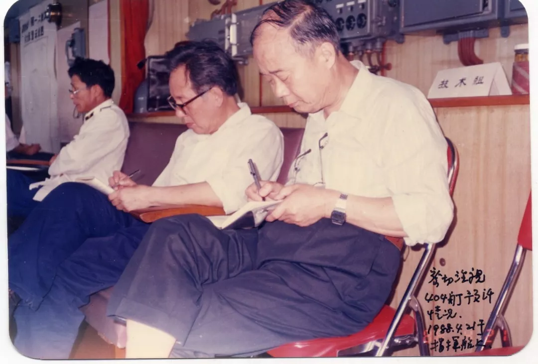 黄旭华(中)在核潜艇指挥船上工作。
