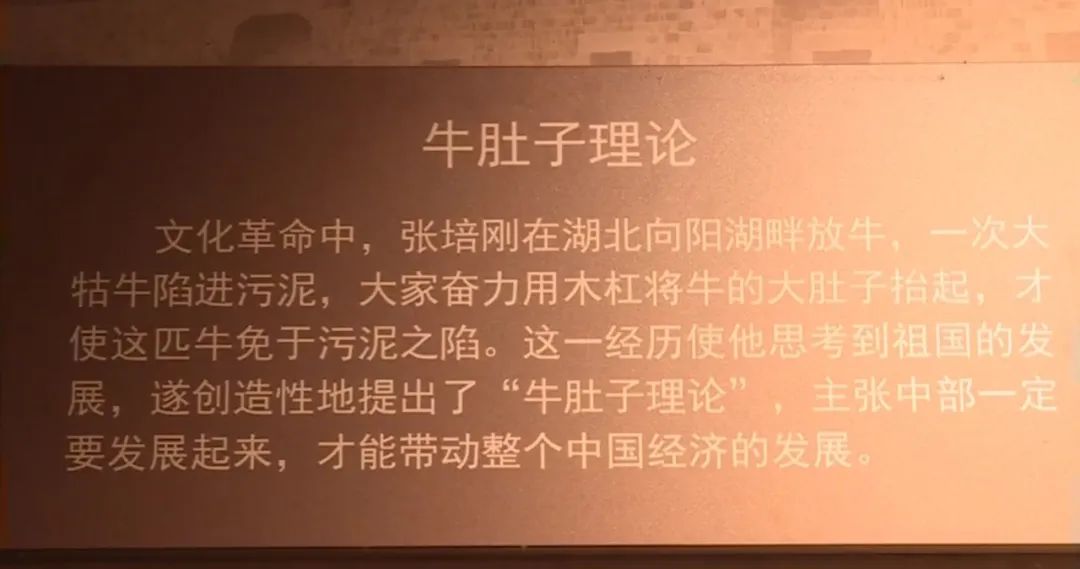 艰苦的劳动生活并没有压垮一代经济学大师的肩膀。张培刚曾经讲过文革时在农村放牛的情形:早上天不亮就起床,带着两个杂粮馒头去牛棚牵牛,把牛引到水草丰盛的地方,找个树桩木杈将牛绳栓牢,就能一边欣赏湖光山色和水田上站立的白鹭,一边从矮树丛中捡一些干柴,升起火来烤馒头吃。从湖北农村走出来的、生肖属牛的张培刚,对牛这种动物始终抱有一份特殊的感情。1971年冬,张培刚在放牛的实践中总结出“牛肚子理论”,他是这样描述的:“有一次放牛时,一头大牯牛不慎陷入泥沼,我们赶忙牵牛鼻子,拉着牛头使劲往上拉,可是牛身却越陷越深。正束手无策时,有人扛来几根粗木杠,垫起牛肚子部位,大家齐心协力,很快将这头大牯牛拉出泥潭。”张培刚说,中国这么大,上海和沿海城市就是“牛鼻子”,广大中部地区就是“牛肚子”,重庆和其他西部城市是“牛尾巴”。如果这头牛要飞奔,中国经济要起飞,只拉牛鼻子、只扯牛尾巴,牛肚子还坠在地上,会有用吗?“牛肚子理论”就是在沿海开放同时实行中部崛起,带动西部开发,促成整个国家经济的腾飞。此后,这个理论成为“中部崛起”的理论依据。