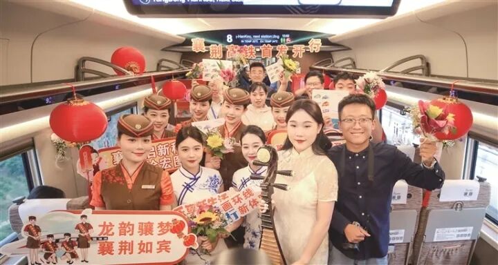 车厢内,首发之旅热闹非凡。国风旗袍舞《青花瓷》赢得阵阵掌声,身着“楚韵”服装的乘务员表演《乐享龙韵骧梦》礼仪舞,传递荆楚文化魅力;知识互动问答、集章打卡、文创印章环节让旅客笑声不断。