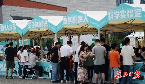 科技体验与生态景观深度融合,催生出新的游玩模式。光谷空轨在光谷中央生态大走廊串联起五大站点,开启国庆嘉年华活动,现场有无人机静态展示,还有无人机足球赛、象棋机器人等,吸引了众多科技迷到此体验。