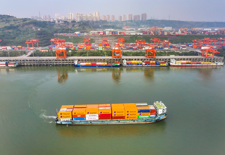 重庆果园港,满载集装箱的货船驶出港口(图|视觉重庆)