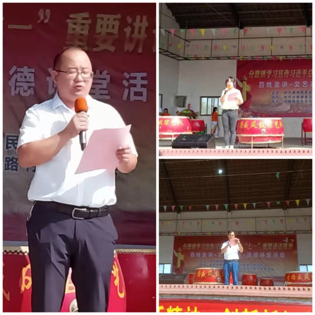 分路镇党委宣传委员、副镇长提名人洪稳胜致开幕词。接着由分路村百姓宣讲团成员吴桂华同志作习近平总书记“七一”重要讲话精神的宣讲,吴桂华同志以铿锵有力的声音,分别从“革命”、“建设”、“改革”、“新时代”四个时期,回顾了我党百年走过的光辉历程,向每位村民展现了一部光辉的共产党发展史。再由镇一级科员邹磊向参加活动的观众讲述我们身边的人如何用一言一行践行自己的社会道德,让我们感到“道德”二字离我们并不遥远,它就在身边,看得到也学得到。