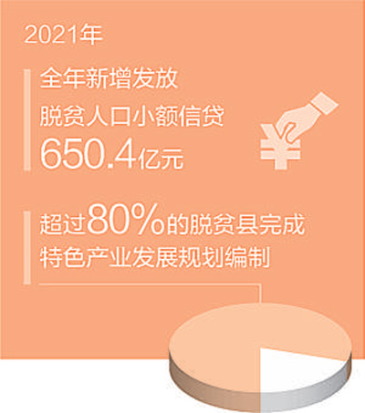 发展产业是巩固拓展脱贫成果的治本之策,也是乡村振兴的长远之计。各地加强规划引导、加大资金投入,加快补齐技术、设施、营销等短板,促进脱贫产业提档升级。去年全国新增发放脱贫人口小额信贷650.4亿元,支持155.7万户发展生产。超八成的脱贫县完成特色产业发展规划编制,脱贫地区特色产业稳步发展壮大。