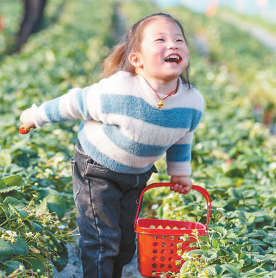 江苏宿迁市宿豫区建设高标准扶贫基地。图为一名小朋友在新庄镇草莓扶贫基地玩耍。