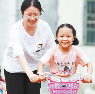 广西恭城瑶族自治县在社区和行政村建立“儿童之家”,提升公共服务水平。图为在秧家村“儿童之家”,大学生志愿者在陪伴孩子骑车。