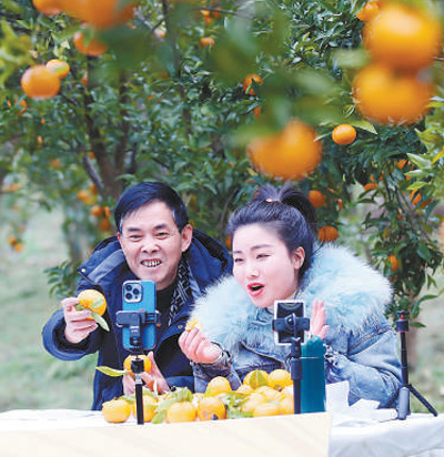 重庆市黔江区阿蓬江镇巩固发展脱贫产业。图为在当地柑橘丰收节现场,电商主播和村民在销售柑橘。
