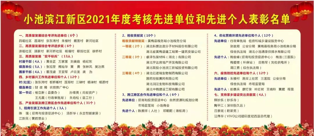 会上,小池滨江新区党工委委员、小池镇党委副书记朱章洪通报了市县表彰情况并宣读了镇委、镇政府表彰决定,对2021年度考核先进单位和先进个人进行了表彰。