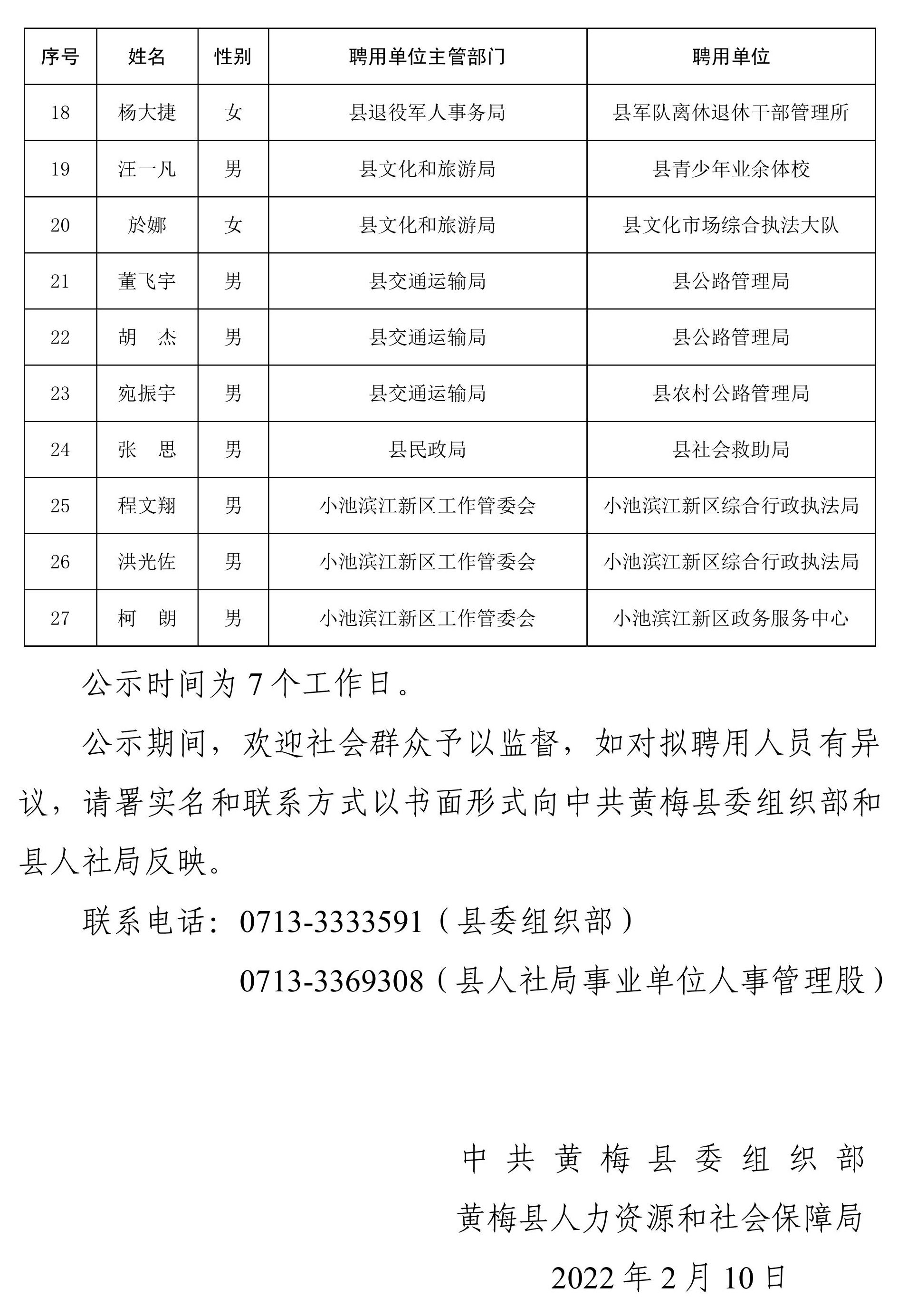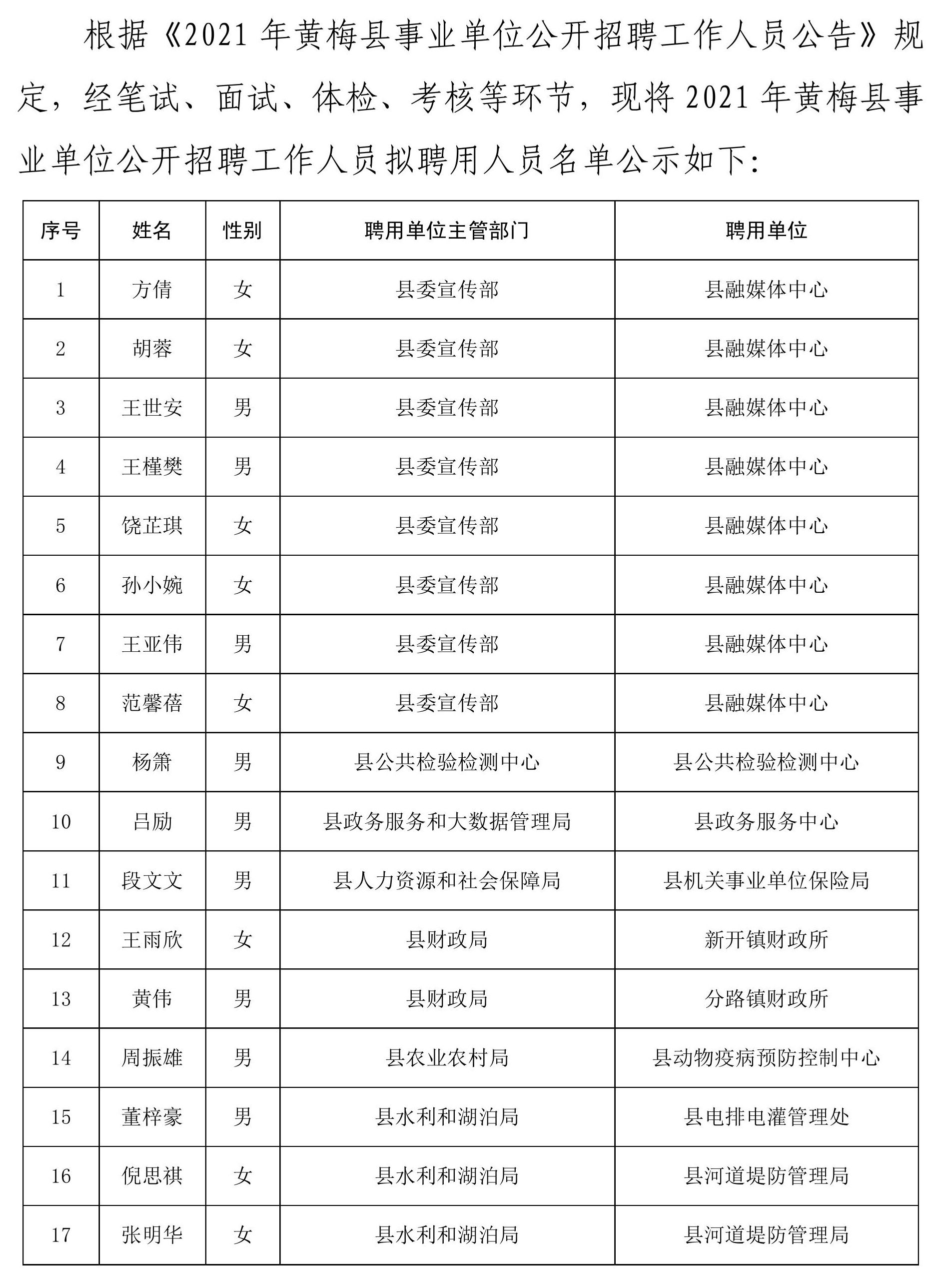 2021年黄梅县事业单位公开招聘工作人员拟聘用人员名单公示