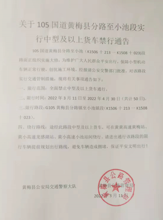 105国道黄梅县分路至小池(K1506十213一K1508十023)段路面正组织实施大修,为维护广大人民群众平安出行,保障小型机动车辆正常行驶,创优施工环境,经报请公安交警部门批准,对该路段实行交通管制措施,现将有关事项通告如下: