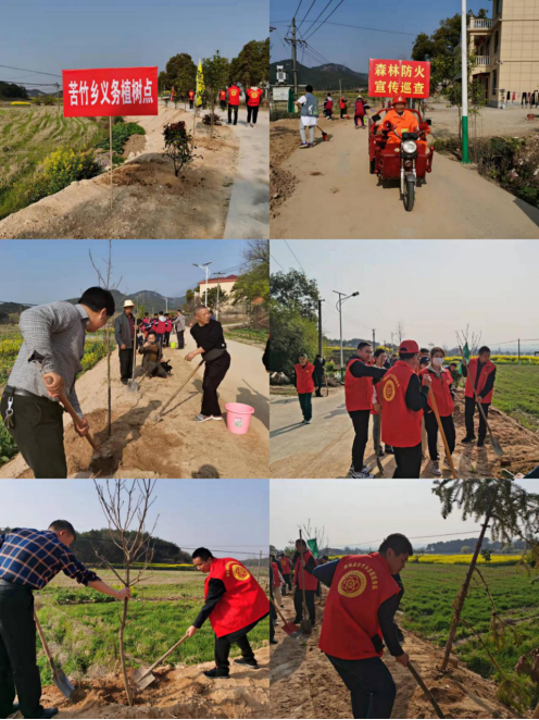植树现场,油菜花环绕,鸟鸣啾啾,微风阵阵。面对如此优美的田园风光,大家热情高涨,干劲十足。在乡党委书记孙丽的带领下,全体国家干部以及师生自由组合、分工合作,配合默契,严格按照栽种标准,确保植一棵活一棵,栽一片绿一片。放眼望去,一个个党员干部身穿红马甲,格外惹眼。大家用自己的实际行动为乡村美化种下希望的树苗,为春天到来增添一抹新绿,经过一番辛勤劳动,一株株绿植错落有致,昂然挺立,为苦竹乡安山村平添一道靓丽的风景线。