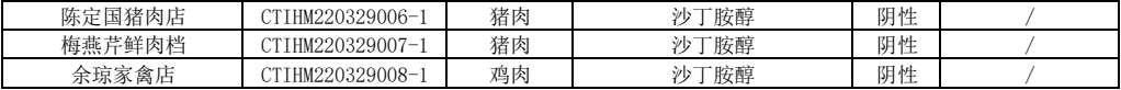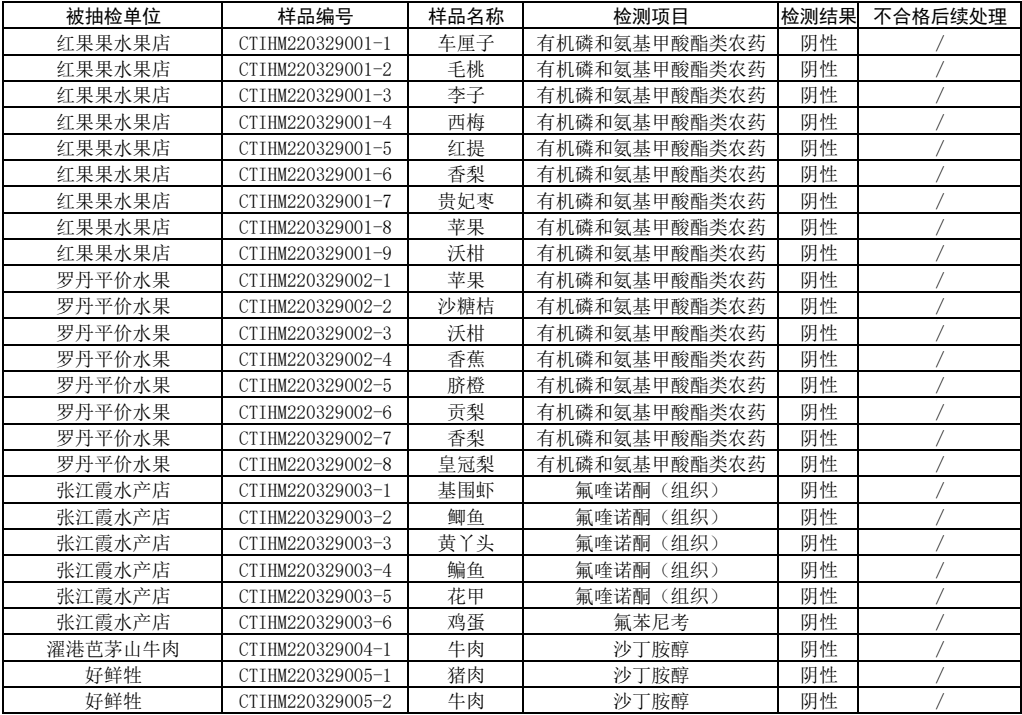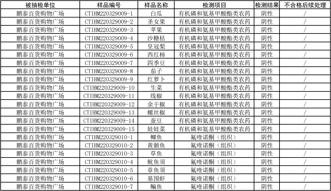 抽样日期:2022年3月29日 检测日期:2022年3月29日 被抽检单位:鹏泰百货购物广场 检测单位:黄梅县市场监督管理局快检服务中心 抽样日期:2022年3月29日 检测日期:2022年3月29日 被抽检单位:古塔菜场 检测单位:黄梅县市场监督管理局快检服务中心