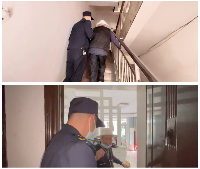 随后,执法人员将老人护送到八角亭花园小区,老人才记起自己的家的位置,执法人员一路搀扶老人上小区单元楼四楼,将老人安全送回家中。老人的家属正在焦急地寻找,看到老人安全回家,十分激动,连连道谢。