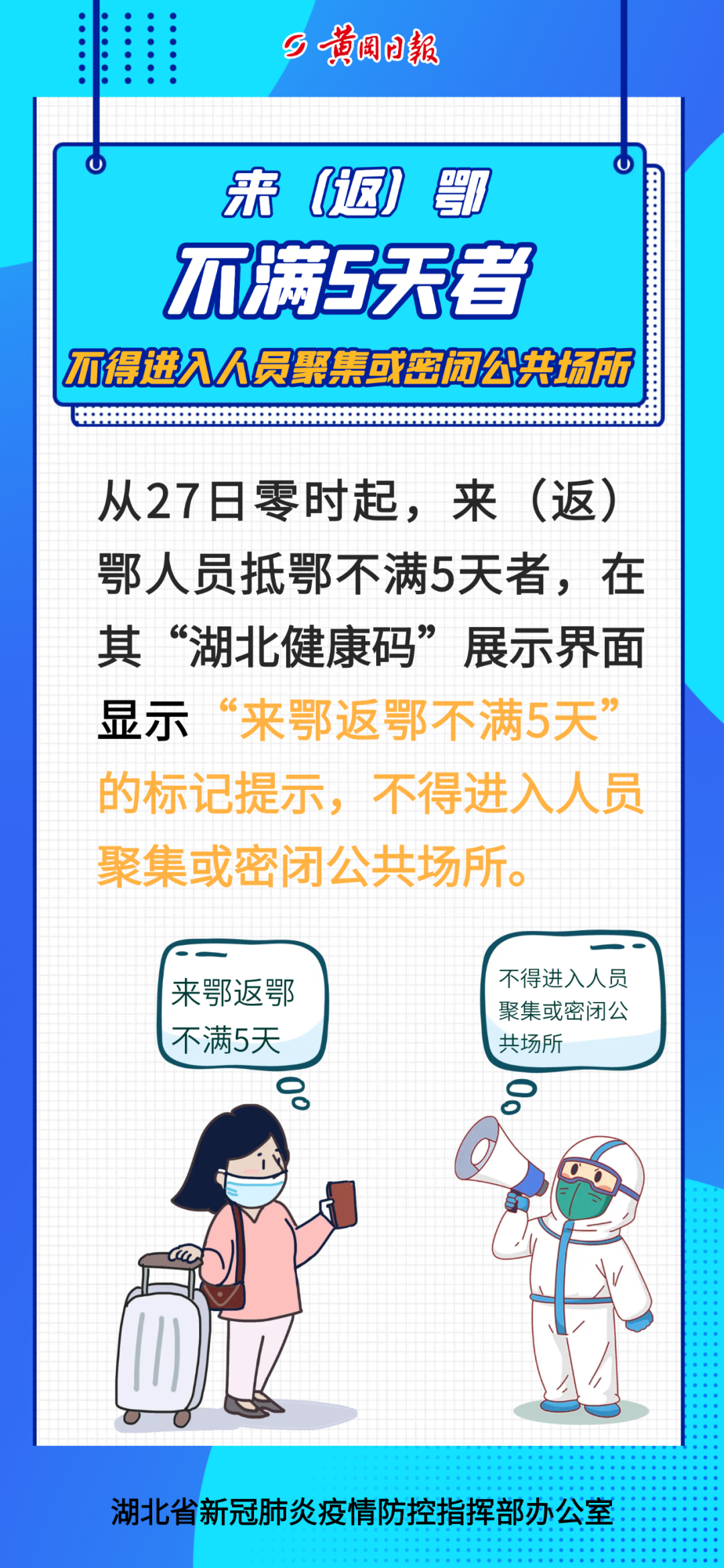 省疫情防控指挥部专家呼吁,疫情防控离不开社会各界共同努力,请广大群众支持配合各项疫情防控措施,特别是来鄂返鄂人员务必提前向所到社区报备,遵守“抵鄂不满5天不得进入人员聚集或密闭公共场所”等相关防控措施,其他居民非必要不外出、不聚集、不到人多密闭场所,主动扫码亮码,坚持参加核酸检测,做好个人防护和健康监测,切实履行健康第一责任人的职责。