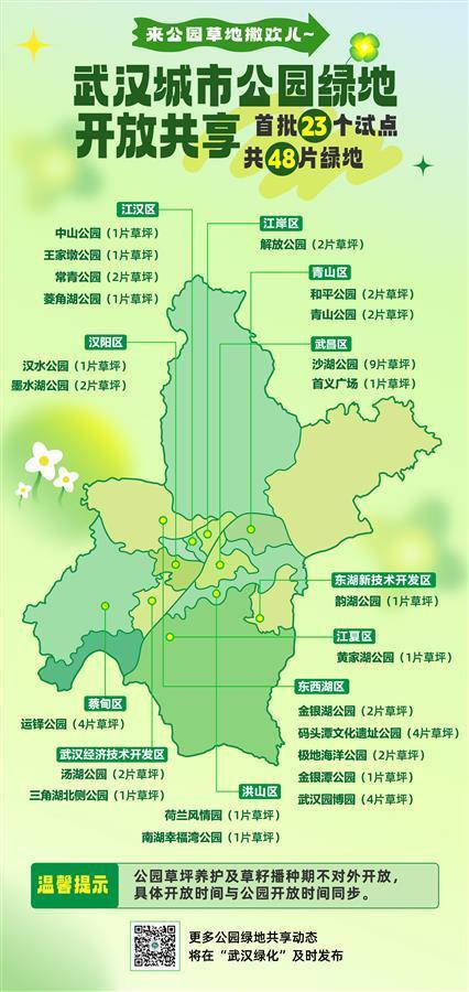 据了解,根据住建部、湖北省住建厅近日发布的城市公园绿地开放共享试点工作通知,武汉市园林和林业局经过对武汉百余个公园进行调研,按照“应试尽试、分批试点”、坚持“因地制宜、遵循规律”的原则,最终确定了首批开放共享试点公园。全市23个城市公园绿地共享试点,共有48片草坪,约56万平方米,将更好地满足市民游客亲近自然、休闲游憩、运动健身等新需求和新期待。
