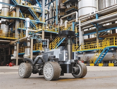 山东省东营市,东营区化工产业园区里,智能巡检机器人在巡检厂区设备,实时采集现场图像、声音、温度等数据,对设备实现精准管理,保障厂区正常运转。