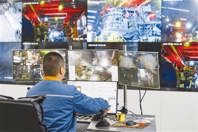 江苏省南京市雨花台区,宝钢股份梅山钢铁行车操控中心内,工作人员在地面集控室进行远程操作。随着5G技术广泛应用,钢铁行业加快数字化转型升级,打造“5G+数字炼钢”应用场景,实现作业少人化、无人化,有效提升安全性。