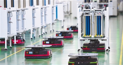陕西省西安市,智能搬运机器人在隆基单晶硅太阳能电池工厂内转运物料。企业不断提高智能化水平,开展基于资源匹配、绩效优化的精准派工,实现人力、设备、物料等制造资源动态配置,优化生产环节物料调度,确保产能稳定。
