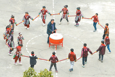 孟荣达(中)与学生练习瑶族长鼓舞。