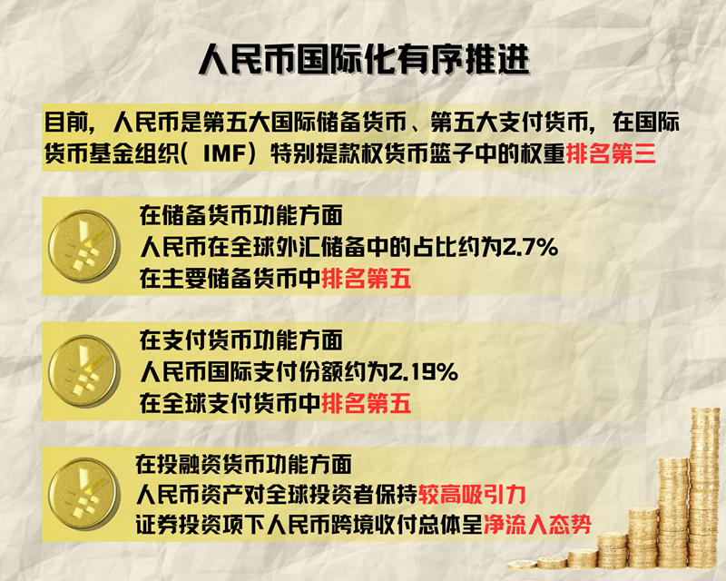 目前,人民币是第五大国际储备货币、第五大支付货币,在国际货币基金组织(IMF)特别提款权货币篮子中的权重排名第三。