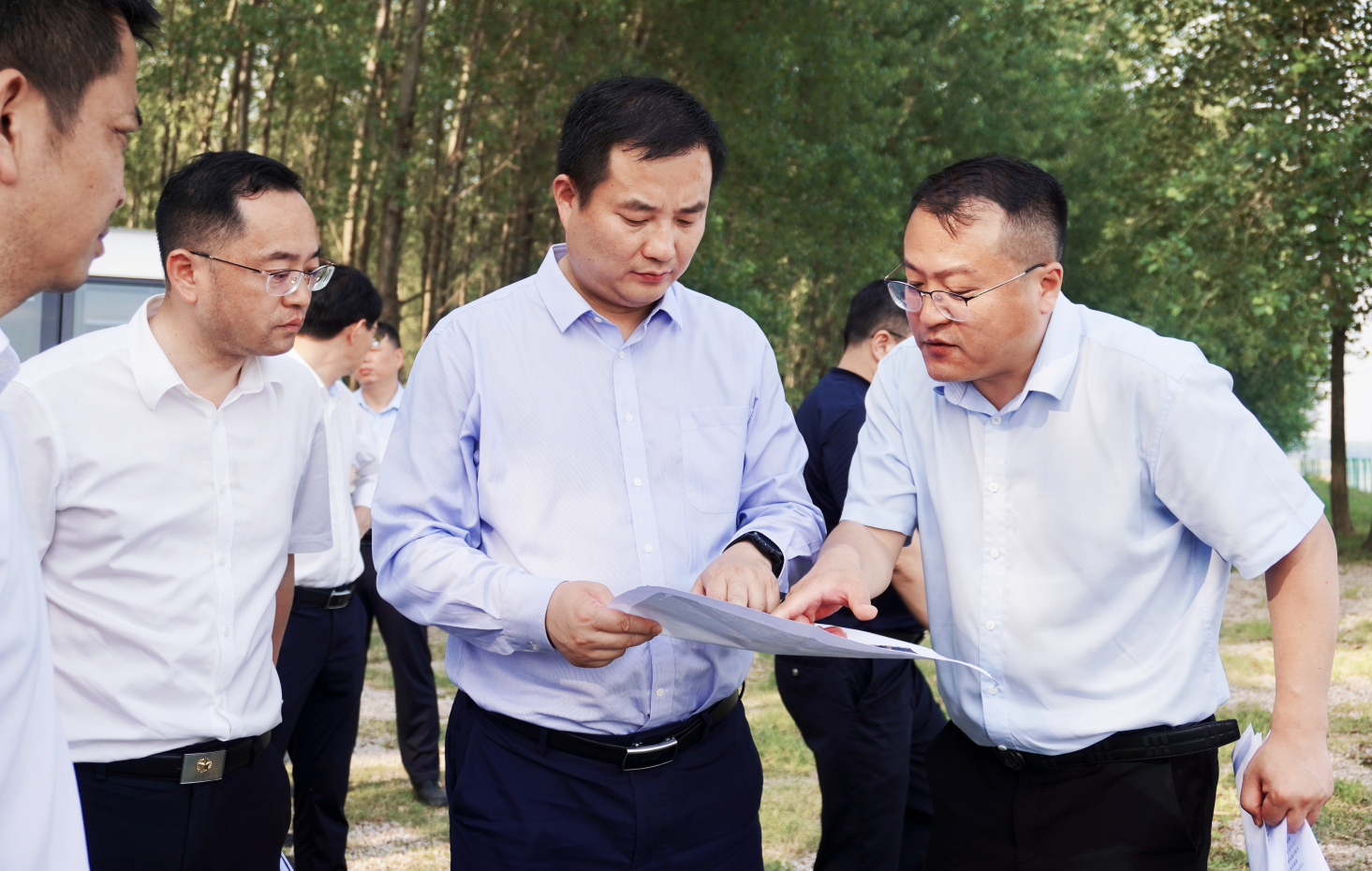 在大河镇徐墩村,马梁仔细查看小麦长势、土壤墒情和成熟程度,并与技术人员进行现场交流,详细了解小麦制种培育和病虫害防治工作情况。