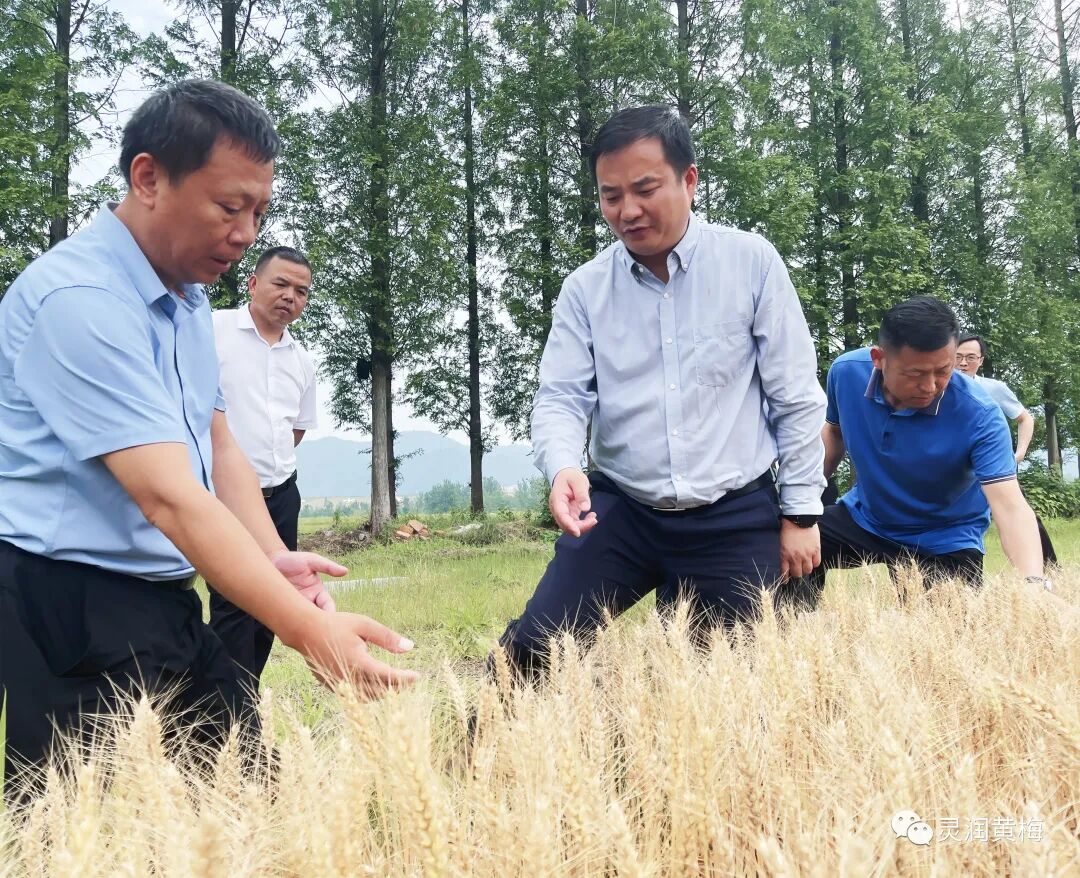 在大河镇徐墩村,马梁仔细查看小麦长势、土壤墒情和成熟程度,并与技术人员现场交流,详细了解小麦夏收情况和病虫害防治情况。